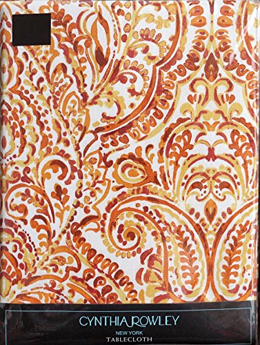 -. Feature : Cynthia Rowley Fabric Tablecloth / Mustard, Yellow, Rust, Orange Paisley on Cream / 60" x 84" -- Oblong Rectangular -- Seats 6-8 / 100% Cotton, Machine Washable