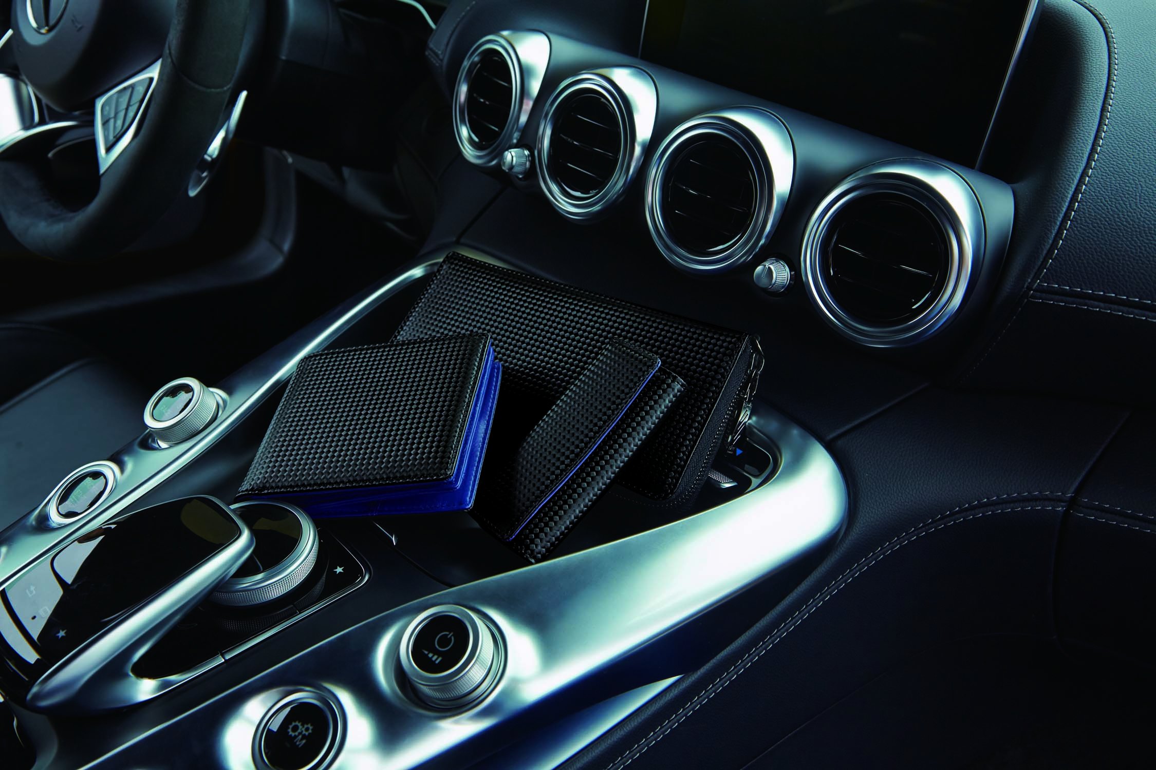 Using a material called "Carbono Fiber Cure" which is a leather material laminated with ultra-thin carbon film on cattle floor leather, the gloss change appeals its own presence by the way of light