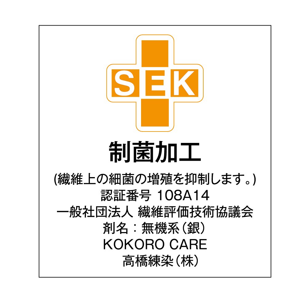 Antibacterial treatment (Suppress growth of bacteria on fibers.) Certification number: 108 A 14 Fiber evaluation technology consultation agent Inorganic name (silver) KOKORO CARE Takahashi Kiriden Co., Ltd. ● Please note