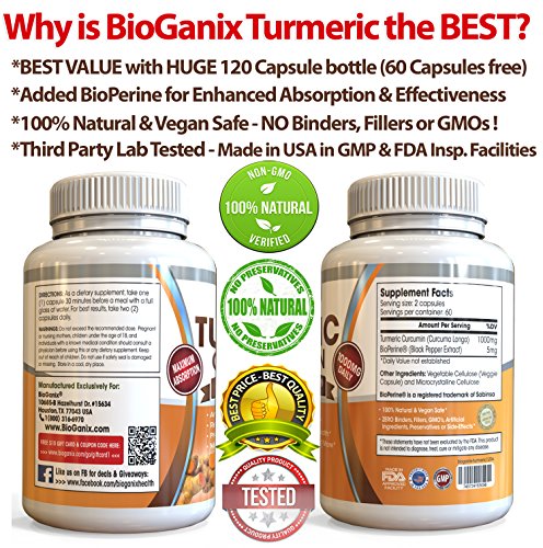 Excellence: Our Trusted Brand Provides you with a High Quality and Effective Dosage of Turmeric Curcumin with added BioPerine (Black Pepper Extract) for Better Absorption; There are cheaper alternatives, but Bioganix is a quality-driven brand that refuses to compromise. We love and use what we make.