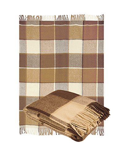 Pure Wool Throw Blanket with fringe 55x79” (Twin) classical Tartan Beige Brown, Medium Weight, By Yaroslav Mill.