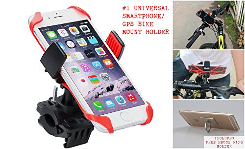 -. Feature : *Top Quality #1 Bike Mount Phone Holder design and very easy to setup (No Tools needed to Install) plus Silicone Band for firm grip and antiShock for SmartPhones, Portable Speakers or GPS with easy 360 degrees Rotating Base for most convenient position. / * Includes FREE Cell phone holder plus Hook-mount - Enables it to mount devices on flat surface, like cars, tables, cupboards etc. using advanced and sticky pressure sensitive adhesives. / * Very Cool and Premium Looking FREE Phone Ring Holder provides a comfortable, safe and secure grip for users with a size that fits the fingers of most men and women.The plate is very thin and can rotate 360 degree and swivel 180 degree comfortably while on a finger to enable multi-tasking, avoiding phone dropping. / * UNIVERSAL BIKE PHONE HOLDER MOUNT fits any modern smartphones and GPS devices and fits motorcycle and 99.99% of bicycle handlebars with varying diameter. Holds iPhone 6, iPhone 6 Plus, iPhone 5, iPod Touch, Samsung Galaxy S6 S5 S4 S3, Note 1, Note 2, Note 3, Note 4, LG G4 HTC One Nokia Lumia Google Nexus Sony Xperia GPS, Blackberry z10, MX2 3, Motorola Droid RAZR / MAXX, HTC EVO 4G, HTC One X, LG Revolution, GPS Holder and More!