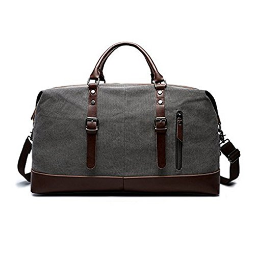 -. Feature : Material: High quality canvas bag + PU leather straps + Smooth Zipper. The duffel bag is classic military style. The canvas is heavy and durable, the base and handles are leather sewn and attached with rivets. The main zipper has heavy duty nylon teeth zipper and a metal tab. / Size: 54cm*33cm*24cm(L*H*D)/21.3''*13''*9.4''(L*H*D). Large Capacity: 55L. It is larger than a normal gym bag, but the size is perfect for a weekend bag and approximately the maximum size of a carry-on bag. / The travel bag is a reliable, well built, classically designed weekender and the construction is fantastic. The inside of the bag is lined with a woven material. The large compartment can put a laptop, iPad, notebooks and clothes; Two inside zipper pockets can store small items without having them roll around inside the large compartment; Two open pockets for organization; Two external pockets can easily hold a phone, passport, tickets and other essentials for a trip. / The duffel has top notch construction. There is a leather tip detail around the bottom of the bag. The bottom is canvas with meta studs for feet. The bag also has a detachable wide adjustable canvas strap that can be used as a shoulder bag to carry the bag over a shoulder if desired. / It is the perfect size to carry your family clothes and essentials for an overnight or weekend trip. It also works as a spare bag that can be packed away in a suitcase and then used to carry back family gifts from a trip or vacation