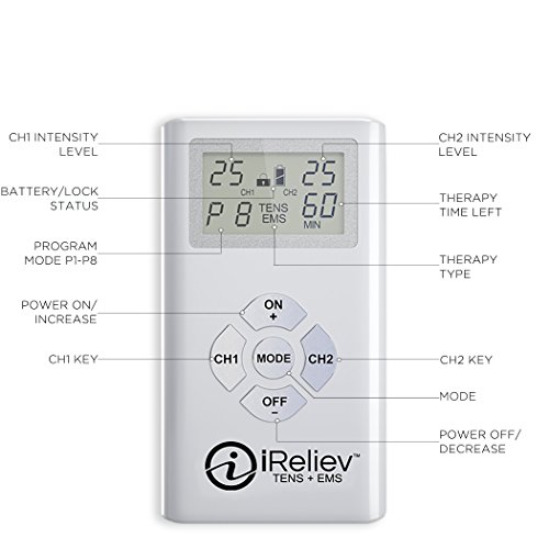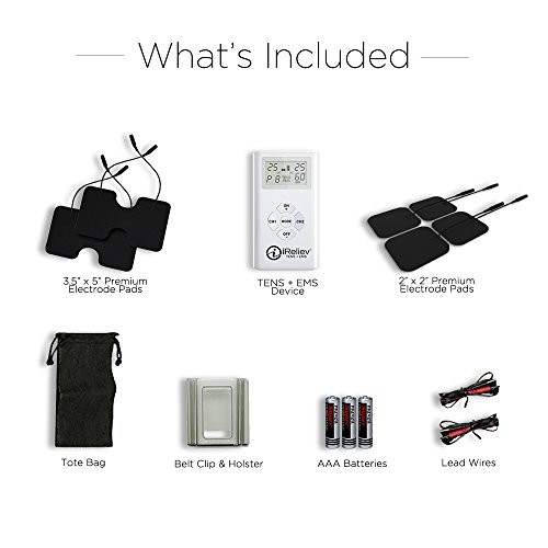 Get the Competitive Edge with On Demand Pain Relief, Massage Muscle Performance. Great for Arthritis too! Athletes and Performers have long benefited from two clinically supported modalities to help relieve pain (TENS or Transcutaneous Electrical Nerve Stimulation) and improve muscle performance and recovery (EMS or Electrical Muscle Stimulation). You can too, now with the iReliev Strength Recovery System FDA cleared for ease of use and safety. This highly innovative dual channel device offers 14 pre-programmed therapy modes making this system extremely easy to use and extremely versatile. The integrated TENS modes (P1-P8) generate a safe and effective output sensation that helps block pain receptors or increase endorphins, a natural pain reliever. The pre-set EMS programs (P1-P6) deliver rhythmic massage-like impulses that help increase blood flow to promote muscle recovery, strength and performance. Compact and portable, use iReliev on the go, at the gym or at home. System includes: iReliev TENS EMS Device, (4) 2” x 2” TENS Pads, (2) 3.5” x 5” Large EMS Pads, (2) Lead Wires, Clip Holster, (3) AAA Batteries and Storage Tote Bag PHYSICAL THERAPIST ENDORSED: I, Joseph R. Noel, PT, being a licensed Physical Therapist in the State of Florida and having practiced as a Physical Therapist for the last 24 years do hereby recommend the iReliev TENS EMS unit for effectively treating pain. TENS EMS has been used for decades to manage pain and the recent FDA approval of the OTC unit made by iReliev is soon to be the industry standard. I have used TENS EMS in my clinical practice and have recommended home use in the past before FDA approved OTC devices. 0