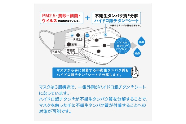●光がなくても作用する触媒を使用していますが、その性質上、光が当たると機能が上がります。それに伴い、時間経過によりマスクに色調変化が出現することがありますが、機能には問題なくお使いいただけます。