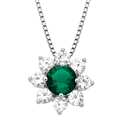 -. Feature : Stylized Flower Designs / 2 3/8 ct Round-Cut Created Emeralds / 3 1/2 Round-Cut White Sapphires / Sterling Silver / 18-Inch Box Chain