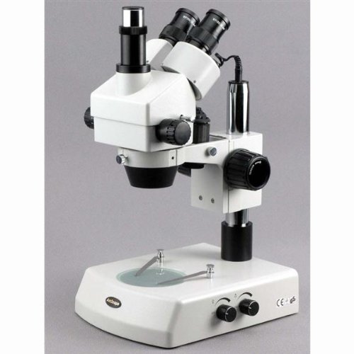 AmScope SM-2TZ-DK-10M Digital Professional Trinocular Stereo Zoom Microscope, WH10x Eyepieces, 3.5X-90X Magnification, 0.7X-4.5X Zoom Objective, Upper and Lower Halogen Lighting, Pillar Stand, 110V-120V, Includes Darkfield Condenser, 0.5X and 2.0X Barlow