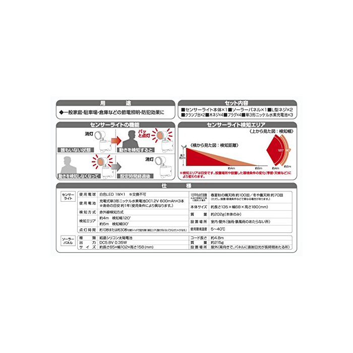 세트 내용:센서 라이트 본체×1,솔라 패널×1,단3 형니켈 수소 충전지×3,클램프대×2,L형 나사×2,목나사×4,플러그×4