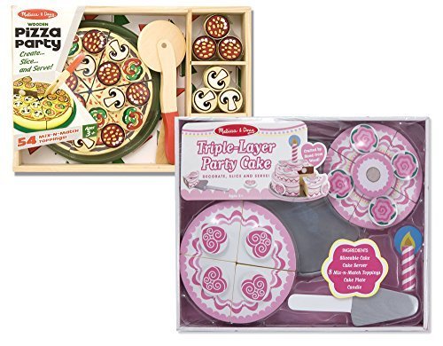 -. Feature : THROW A PARTY - Perfect for tea time with the dolls or pretend time with friends, the Melissa & Doug Pizza Party and Triple Layer Party Cake Wooden Playsets are a great way for your child to throw together their own little shindig with all of the best treats and none of the mess. / GET CREATIVE - Decorate your pizza and your cake with all kinds of toppings, icing, and candles. Your child can make all sorts of combinations from the delicious to the disturbing. Let them combine whatever their imagination desires without wrecking the kitchen. / MELISSA AND DOUG - We make toys and other products that offer Countless Ways to Play. We believe the best playthings are often simple concepts that inspire children to come up with their own twists. With everything we create, we hope to encourage. / EXCELLENT QUALITY - Each toy made by Melissa & Doug is created with you and your child in mind. Their durable construction, safe features, and fun designs are everything that you could want in a toy. Trust in Melissa & Doug to bring only the best into your home. / PRODUCT SPECIFICATIONS - Package contains (1) Melissa & Doug Pizza Party, six sliceable wooden pizza slices and more than 50 toppings, Wooden and (1) Melissa & Doug Triple Layer Party Cake, includes eight cake slices, eight mix-and-match toppings, cake plate, serving knife and candle, Wooden. Recommended for ages 3+.