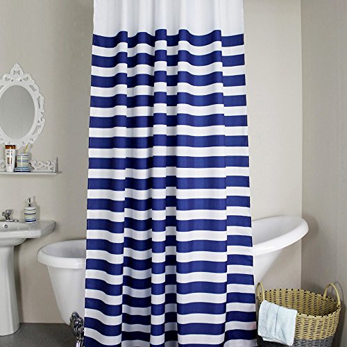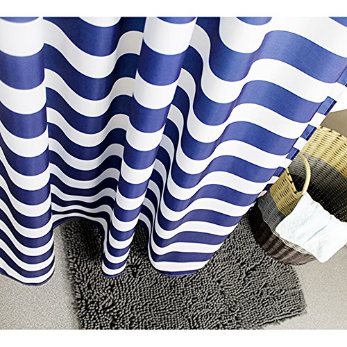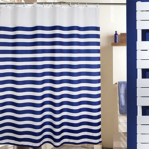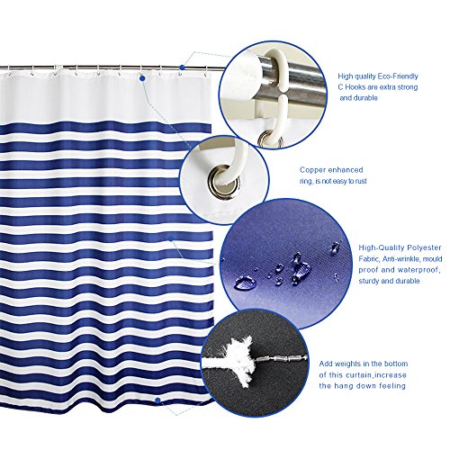 MangGou Fabric Shower Curtain,Nautical Stripes Shower Curtain Liner,Waterproof Polyester Bathroom Curtain With 12 Hooks,Mildew resistant,Machine Washable,Navy Blue and White,72 x 72 inch