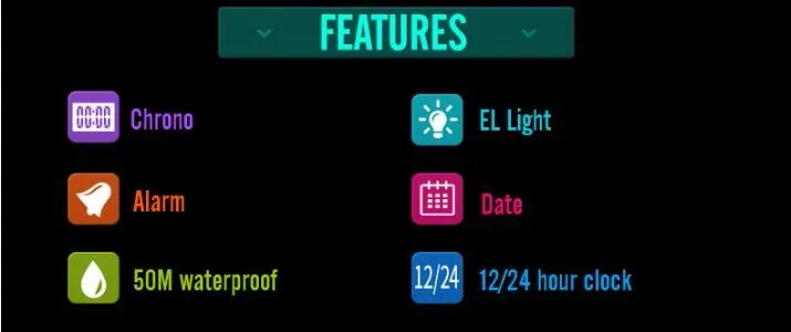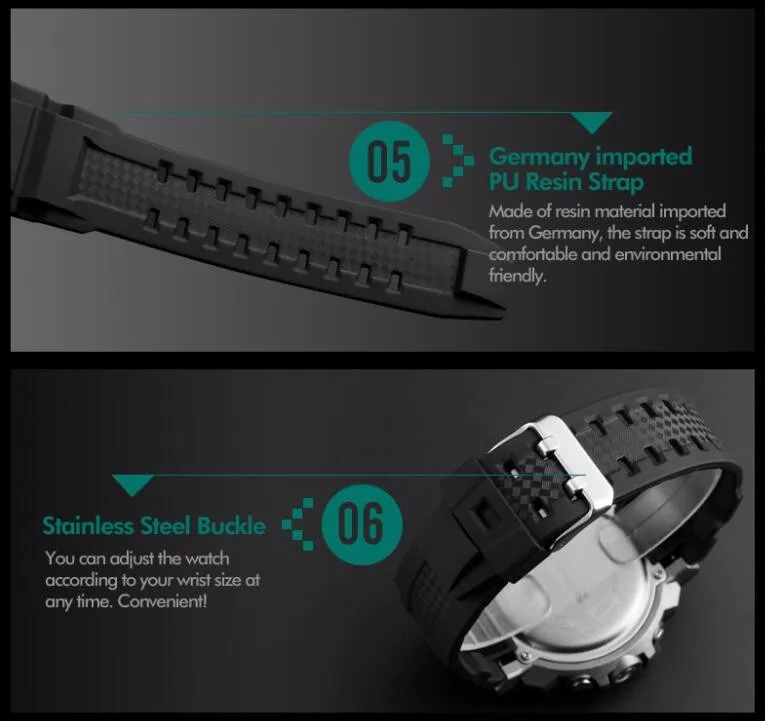 Feature:Alarm,Back Light,Water Resistant,Shock Resistant,Complete Calendar,Swim,Chronograph,Auto Date,LED display,Diver