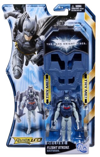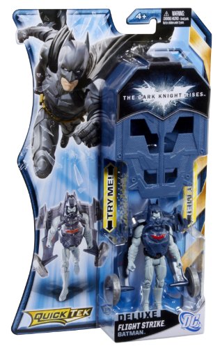-. Binding : Toy -. Brand : Mattel -. EAN : 0746775112981 -. Feature : Inspired by the hit new Batman film, The Dark Knight Rises / Kids can gear up like Batman and fight the villains of Gotham City / Instantly change into fighting gear with an arsenal of weapons and accessories / Includes one figure and QuickTek accessories / A must have for any Batman fan -. IsAdultProduct : 0 -. Label : Mattel -. LegalDisclaimer : Each sold separately.Figures may not stand as shown.Subject to availability.Colors and decorations may vary.May contain small parts. Not intended for children under 3. -. Manufacturer : Mattel -. Model : W7200 -. MPN : W7200 -. PackageQuantity : 1 -. PartNumber : W7200 -. ProductGroup : Toy -. ProductTypeName : TOYS_AND_GAMES -. Publisher : Mattel -. ReleaseDate : 2012-05-27 -. Studio : Mattel -. Title : Batman The Dark Knight Rises QuickTek Flight Strike Batman Figure -. UPC : 746775112981 -. Warranty : 1 year warranty against manufacturer defects