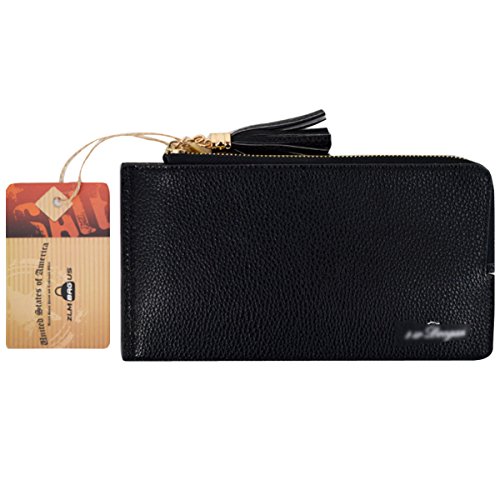 Soft and sturdy faux leather embossed with unique litchi pattern, good looking and durable; classic solid black color, zipper and copper button double closures, a pretty and useful accessory for both men and women.