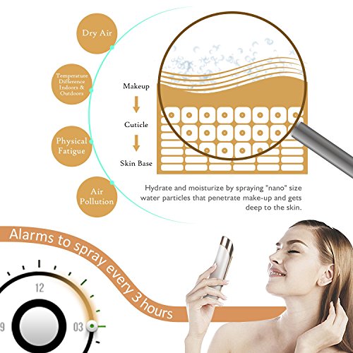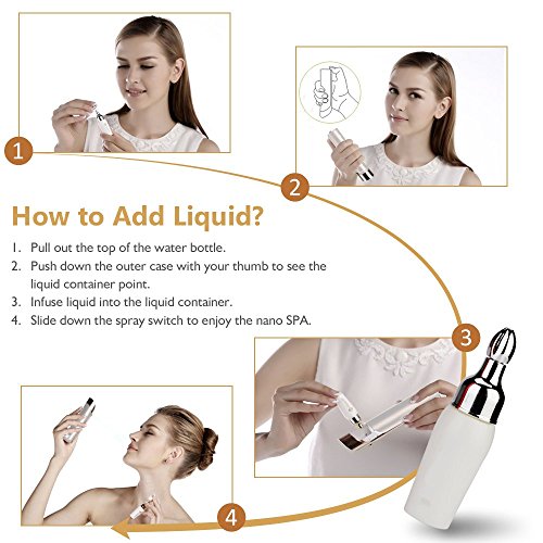 Nano Facial Steamer: Spray "nano" size water particles that penetrate make-up and gets right to the skin to hydrate and moisturize. Since water droplets are so small that make-up does not run like other mist products and gets absorbed into the skin more effectively. You can also add specialized beautifying toner to convert into Nano mist and penetrate deep into your skin