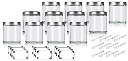 - Includes 12 - 4 oz / 120 ml Clear Glass Straight Sided Jars with Metal Foam Lined Lids + Spatulas and Labels