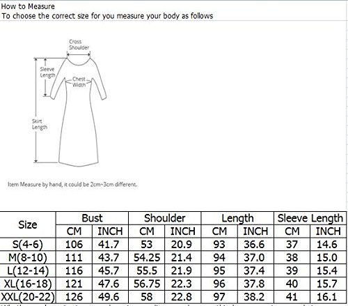 Soft, breathable, elasticity,comfortable to wear, hand washing and machine washing is not easy to wrinkle. Please check the measurement chart carefully before you buy the item. Size Chart: S (US 4-6) Bust: 106cm/41.7"; Shoulder:53CM/20.9"; Length: 93cm/36.6" ;Sleeve Length :37cm/14.6" M (US 8-10) Bust: 111cm/43.7"; Shoulder:54.25CM/21.4";Length: 94cm/37"; Sleeve Length :38cm/15" L (US 12-14)Bust: 116cm/45.7"; Shoulder:55.5CM/21.9";Length: 95cm/37.4" ;Sleeve Length :39cm/15.4" XL (US 16-18)Bust:121cm/47.7"; Shoulder:56.75CM/22.3";Length: 96cm/37.8" ;Sleeve Length :40cm/15.7" XXL (US 20-22)Bust:126cm/49.7"; Shoulder:58CM/22.8";Length: 97cm/38.2" ;Sleeve Length :41cm/16.1"Feature