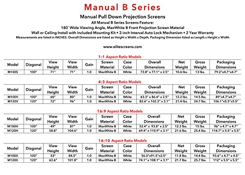 Elite Screens Manual B series is key in professional presentations for home or office. The Manual B series features the 1.0 gain, MaxWhite B front projection screen material. This 4K Ultra HD ready screen not only provides the widest possible viewing angle with perfect diffusion uniformity but also retains precise definition, image color reproduction and black/white contrast. It is fully black backed to eliminate light penetration while enhancing color reproduction, and the 1” black side borders prevent projection overshoot. The sturdy, white steel case easily installs to your wall or ceiling and also allows for suspended installation if desired. The Manual B series features an auto-locking component with 2” interval height settings that allow for adjustable heights. All of these great features at a budget friendly price along with Elite Screens commitment to service and 2-year warranty make the Manual B series of projection screens a great choice for any entry-level or budget-minded projection enthusiast. Since 2004, Elite Screens has become a global leader in projection screen manufacturing through its headquarters in the US and branch offices in Europe, Japan, Australia, India, Taiwan, and China. With a focus on superior product and service, Elite Screens is dedicated to making projection screens for any projection environment. Ask about Elite’s 2-year warranty and 3-year ENR-G enhanced warranty.Feature