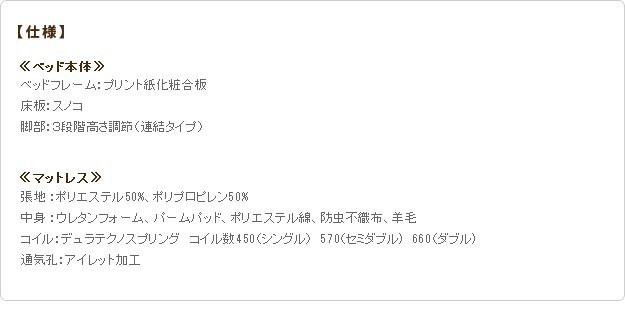 材質:[ベッド]本体-プリント紙化粧合板、床板-スノコ床板、[マットレス]側地-ポリエステル50%・ポリプロピレン50%、中身-ウレタンフォーム・パームパッド・ポリエステル綿・防虫不織布・羊毛、コイル-デュラテクノスプリング・コイル数450、通気孔-アイレット加工