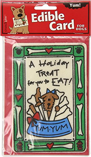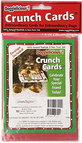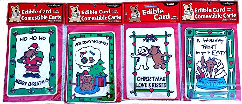 -. Binding : Misc. -. Brand : Crunchkins -. Feature : Pack of four Christmas cards that are also dog treats / 100% natural rawhide / Non-toxic ink that doesn't run / Mailing envelope included for each card / Great for bonding with your pet over the holiday -. Label : Crunchkins -. Manufacturer : Crunchkins -. PackageQuantity : 1 -. ProductGroup : Pet Products -. ProductTypeName : PET_SUPPLIES -. Publisher : Crunchkins -. Studio : Crunchkins -. Title : Crunchkins Edible Holiday Cards for Dogs (Bundle of 4)