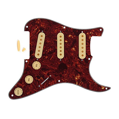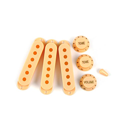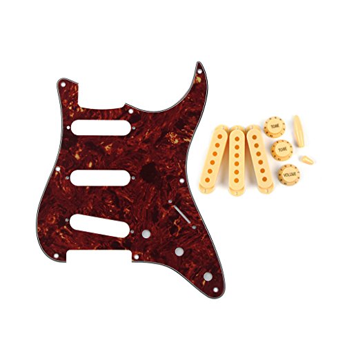 Product Description Feature:* Set of 8 holes gutiar pickguard, pickup covers, knobs and tips Fits USA Vintage 8 hole Fender Style Strat Style Guitar Replacement/ 50s ST Style.* All materials are environmentally friendly, thermostability, no smell. Multi-layer plates are pressed under high temperature and pressures, to make them close integration between each layer, will not appear curly, deformation, or separation of different layers.* Two layers of protective films on the front of pickguards, anti-scratch to protect the guitar.Specification:*Pickguard: SSS(single/single/single coil) style pickguard; 8 screws holes in the side of pickguard.* Material: Pickguard is made of 4Ply, including 3Ply PVC and 1Ply Real Tortoise Plate; Guitar Parts: Plastic PVC.* Pickup covers: 50/52/52mm for single coil pickups.* Knobs: 2 pcs Tone and 1pcs Volume knobs* Swith Tip: for a 5 Way Strat Style Guitar switch or similar.* Whammy Bar Tip: about 5mm inside diameter.* Pickguard Color: Red Tortoise; Guitar Parts' Color: Cream, as pictures showen.* Note: Item's color might be different from the picture because of the aberration. Package Includes:1 x Pickguard3 x Pickup Covers2T1V Knobs1 x 5 Way Switch Tip1 x Bar Tip 0