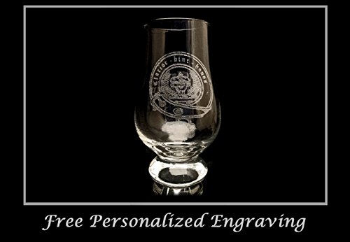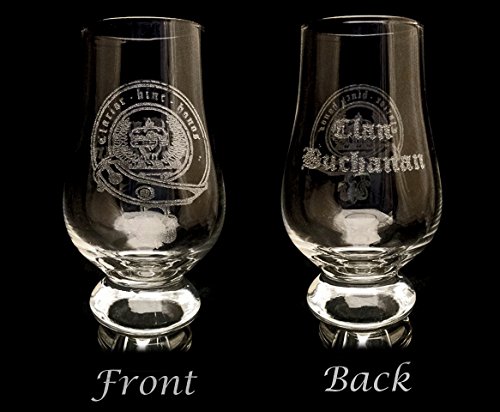 Product Description Clan Buchanan Scottish Crest 6oz Whiskey Glass: Clan Buchanan Blazon: A hand holding up a ducal cap purpure lined ermin, tufted on the top with a rose gules within two branches of laurel, disposed orleways proper Clan Buchanan Motto: Claroir hinc honos, "Hence the greater honor" or "Brighter, hence the honor" This Whiskey Glass is engraved the Clan Buchanan Crest and the words "Clan Buchanan" Opposite in Old English Font. The name Buchanan is a derivative of the Gaelic word bothchanain, "Canon's seat" Clan comes from the Gaelic word "clann" which is translated to "children," used to identify familial groups giving a common sense of generational connection. In Scotland the Clan system that is, Scottish Heraldry and Coats of Arms are regulated to this day by Lord Lyon who manages the Scottish Public Registers of Arms and Genealogies. For more information please send us a message and we will gladly recommend some historically reliable literature and websites. The engraving will not fade and the glass is dishwasher friendly. The glass is hand blown glass by Barconic. Glass Dimensions : Height : 4.5" Width : 2.5" Volume : 6oz *Free Personalization *We will replace any glass damaged during shipping promptly and free of charge 0
