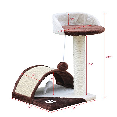Specifications: Material: Selected E1 Fiberboard, Plush, Sisal Rope, Paper Tubes Color: Brown Beige Overall Size: 15"Lx14"Wx20.5"H Bridge Size: 8"Wx6"H Top Perch: Dia 11.5" Weight: 7.3 lbs