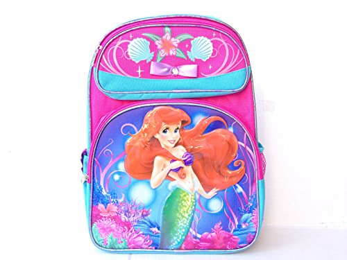 The Little Mermaid Backpack Full size children's backpack Contains a single large compartment and two smaller front compartments Includes a side mesh and velcro pouch Measures 16in (40.5cm) tall, 12in (30.5cm) wide, and 5in (12.5cm) deep