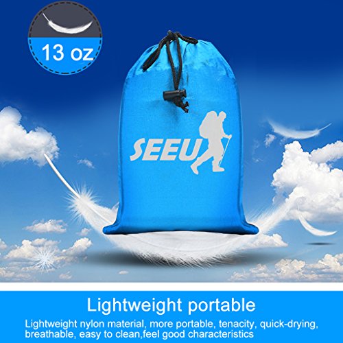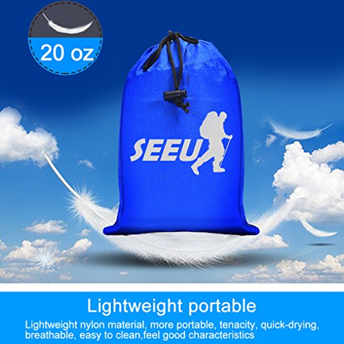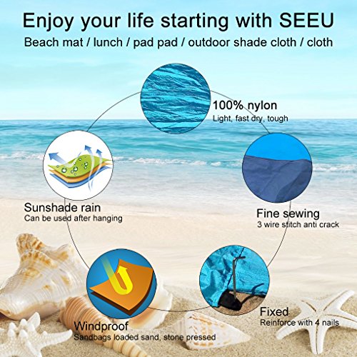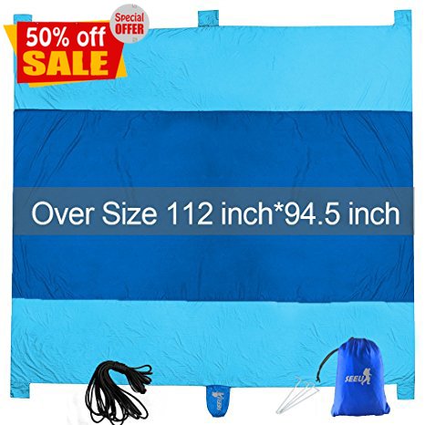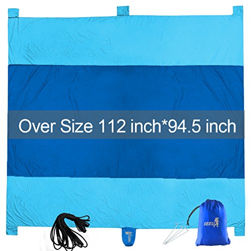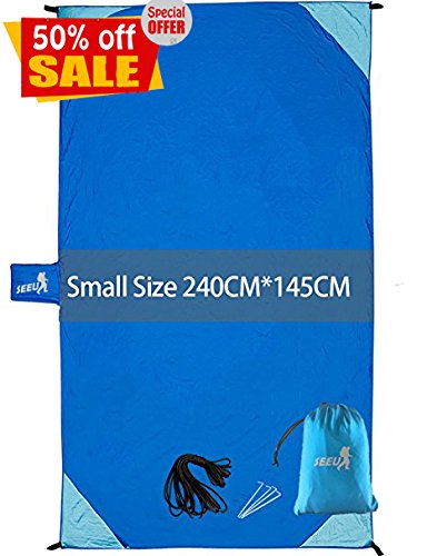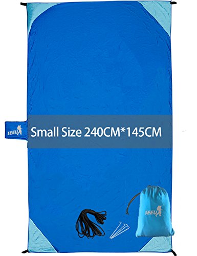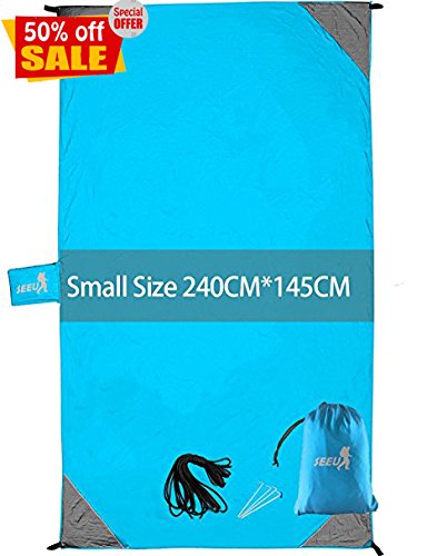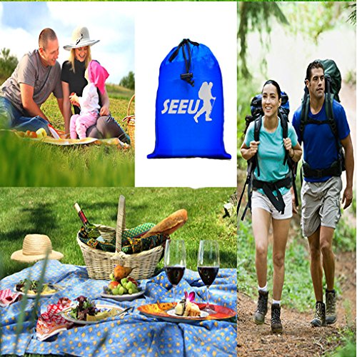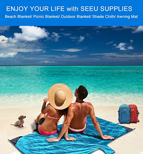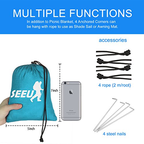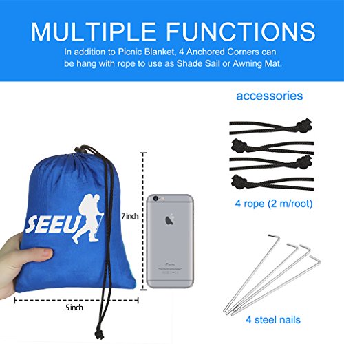 Studio : SEEU Sport Inc. Publisher : SEEU Sport Inc. Binding : Misc. Product Description Make sure you've got enough space for the whole gang with this extra-large outdoor compact picnic beach camping blanket mat that's made from soft, washable nylon with a water-resistant underside to keep damp, wet ground from hindering your plans About SEEU SEEU is specialized in producing professional outdoors and sport products. The ultimate goal of SEEU is to provide quality outdoors products better your life and help you enjoy healthy lifestyle. Product Specifications Product Name: Beach Blanket, Picnic Blanket, Outdoor Blanket, Shade Sail/Cloth, Rain Shelter Material: 210T Water Resistant Ripstop Parachute Nylon Fabric Accessories£º6 sand pockets (stitched on the blanket) , 4 anchor loops steel stakes, 4 ropes of 6.5ft long. Two Size choices£º94*57 inches(Standard); 96*112 inches(Extra large) Weight: 400g(Standard); 600g(Extra large) Colors: Royal blue, bright blue More Details you may interest SEEU picnic blanket is breathable, sturdy and durable, huge but lightweight. It's big enough to allow the whole family, kids or your pets to play on, and can be feld back into the portable attached bag nicely and easily. It has a closable pocket in the center to store things like your cellphones, or keys. Quick drying after use at the beach, and ZERO sand will stick to it. Meanwhile, you can use it as a shade/shelter to protect from sunlight or rain with the help of 4 long ropes we offer to hang it up. IMPORTANT NOTE As made from super-lightweight nylon, this beach picnic blanket is water resistant, NOT 100% waterproof. It may get wet if you put it on damp ground/grass. SEEU GUARANTEES Product Warranty: SEEU promises to offer 100% risk-free replacement if there is any issue with the products within one month after purchase. You can enjoy good time with your family or friends when you're sunbathing on beach, picnicking on grass or camping outdoors.