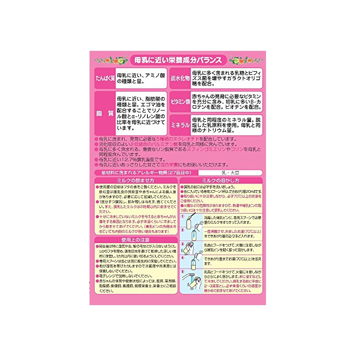 원재료:조정 식용유지(분별 라드,오레오유,대두유,야자유,팜 오레 인)고, 유당,《호에이파우다》,탈지분유,단백질 농축《호에이파우다》,갈락토올리고당,에고《마》유,레시틴(대두 유래)고, 염화 칼슘,구연산 나트륨,비타민C,수 산화 칼슘,탄산 칼륨,타우린,이노시톨,유산 제일철,5''-시틸딜산,유산 아연,5''-유리딜산 나트륨,비타민E,니코틴산 AMI 드,판토텐산 칼슘,5''-《아데니루》산,5''-inosinic산 나트륨,5''-《구아니루》산 나트륨,유산동,비타민B1,비타민A,비타민B2,비타민B6,β?카로텐,엽산,비타민D3,비타민B12