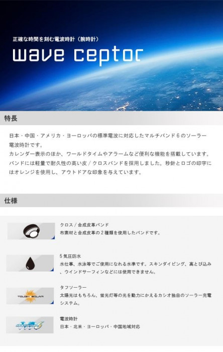 | 時刻を自動修正。日本・中国・アメリカ・ヨーロッパの標準電波に対応したマルチバンド6のソーラー電波時計です。 |