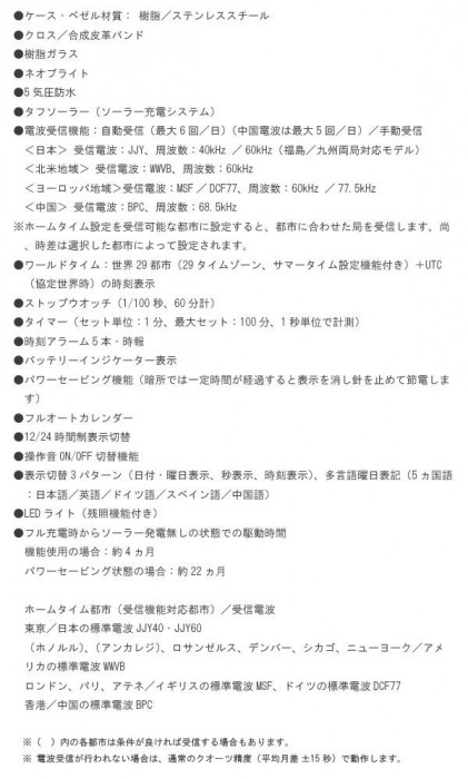 | 仕様 | 適応サイズ(腕まわり):15.0~20.5cm 使用電池:ソーラー充電電池(内蔵) 電池寿命:約7~10年 |