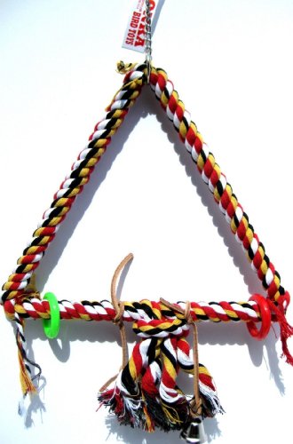 -. Feature : 18"l x 12"w inside of triangle 8.5" x 9.75" diameter 3/4" / Made out of soft cotton rope which includes bells, and acrylic rings your feathered friend will have hours of fun. / This toy is made out of non-toxic food dyes. / Includes chain and quicklinks. / Good for birds to learn to balance.