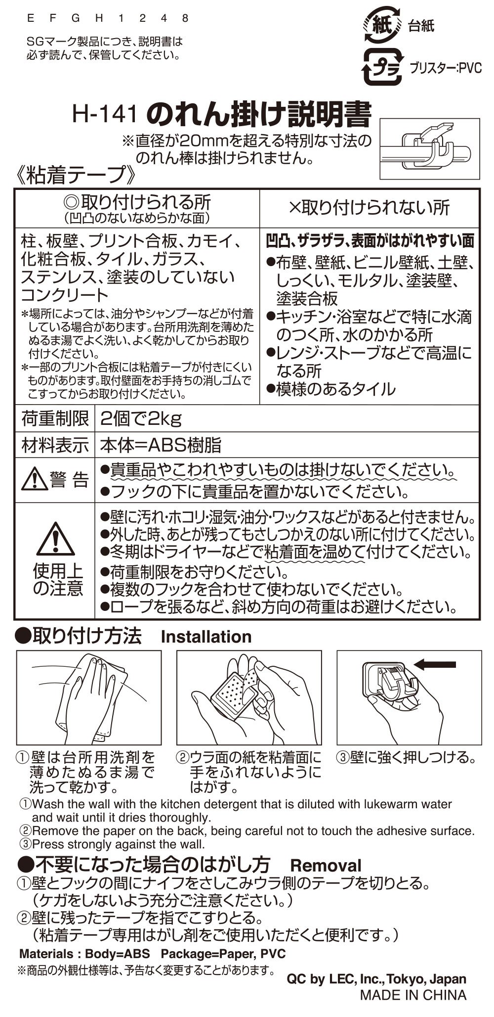 Hook for Noren Bar 2pcs H-141 White By LEC (Japan Import)