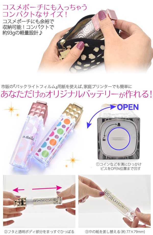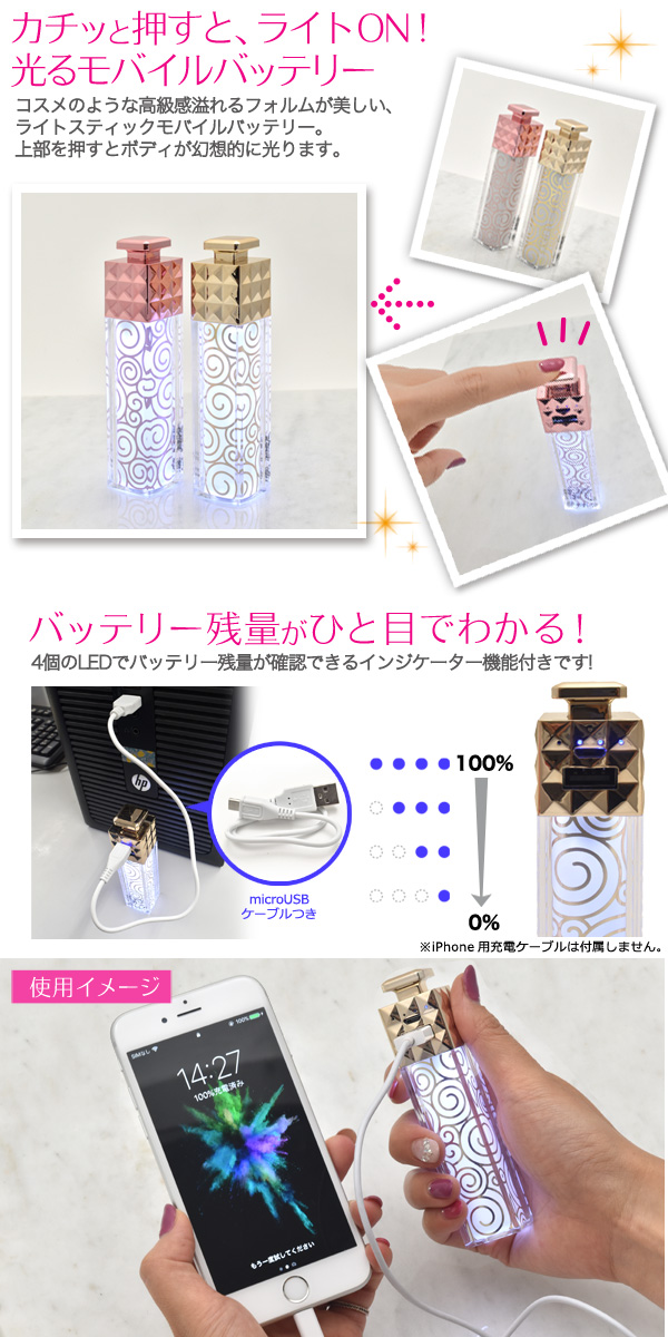■カチッと押すとライトON!光るスティック型モバイルバッテリー コスメのような高級感溢れるフォルムが美しい、スティック型モバイルバッテリー 上部を押すとボディが幻想的に光ります。 ■残量インジケーター付き!♪ 4個のLEDでバッテリー残量が確認できるインジケーター機能付きです! ■USBで蓄電可能♪ 蓄電は付属のmicroUSBケーブルをUSBポートに接続するだけ!別売りのUSB-ACアダプタを使えば、 家庭用コンセントでも蓄電可能です! ■コスメポーチにも入る、コンパクトなサイズ♪ コスメポーチにも余裕で収納可能!コンパクトで約93gの軽量設計♪ ■あなただけのオリジナルバッテリーが作れる♪ ボディのデザインはフィルムなので、簡単に取り外し可能! 市販の『バックライトフィルム』用紙を使えば、家庭プリンターでも簡単に印刷でき、自分だけのオリジナルデザインバッテリーを制作できます。 ■ノベルティなどにも最適です♪ 簡単に中身を入れ替えできるので、記念品やお祝い品、ノベルティ用のオリジナルグッズも制作可能です。 |
