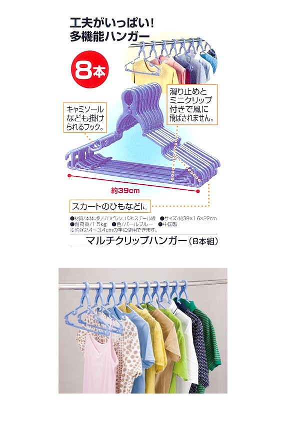 タンクトップやスカートのヒモを掛けられるフック付。タオルなどを掛けるバーには滑り止め「凹凸ライン」と「ミニクリップ」が付いて風に飛ばされにくい!サイズ/横39×縦1.60×高さ22cm素材・材質/本体:ポリプロピレンバネ:スチール線 製造国/中国 ※サプライヤー直送品 ご注文後、当日~1営業日後の出荷となります【商品名】マルチクリップハンガー8本組PB(C)