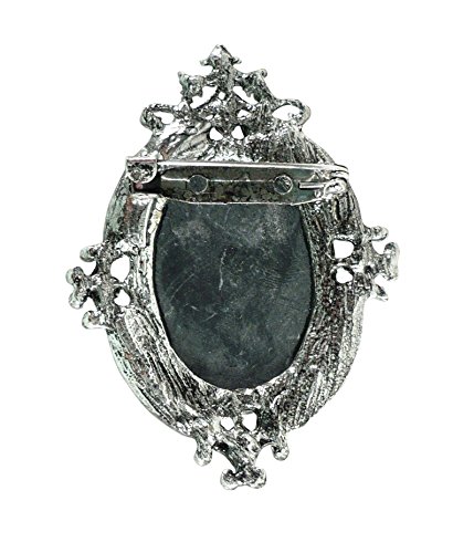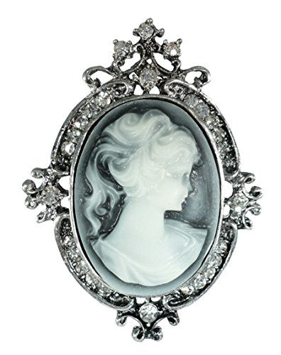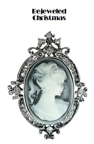 Memories of yesteryear and the romance of Christmas are calling you. Take this antiqued rhinestone resin simulated resin cameo pin. Antiqued gray base metal. About 2 1/2 inches long overall. About 1 7/8 inches wide. Pin back with simple clasp. Not for children age 12 and under. Made in China.Feature