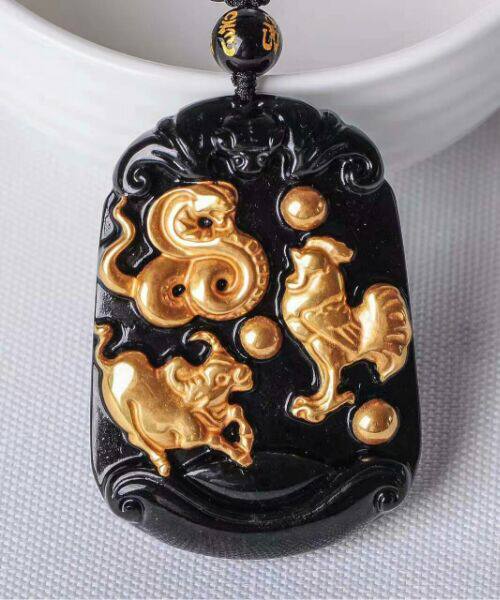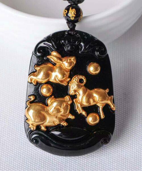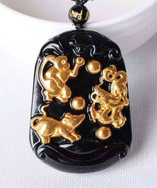 天然黑曜石金镶三合吉祥物通运贵人吊坠项链男女款