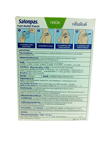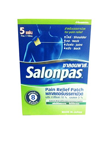 -. Feature : Salonpas pain relief patch (7 cm x 10 cm) (5 patches/pack) / for pain relief: shoulder, neck, joint, back., last up to 8 hours. / Usage: clean the skin is dry, peeling off the adhesive sheet. / free!! sticker Thai_product, souvenir from Thai_product.,High Quality & Services by Thai_product.