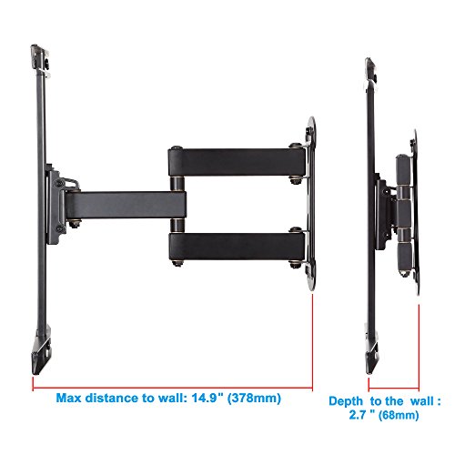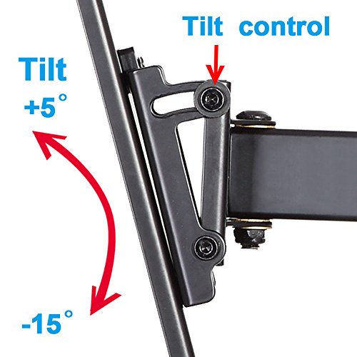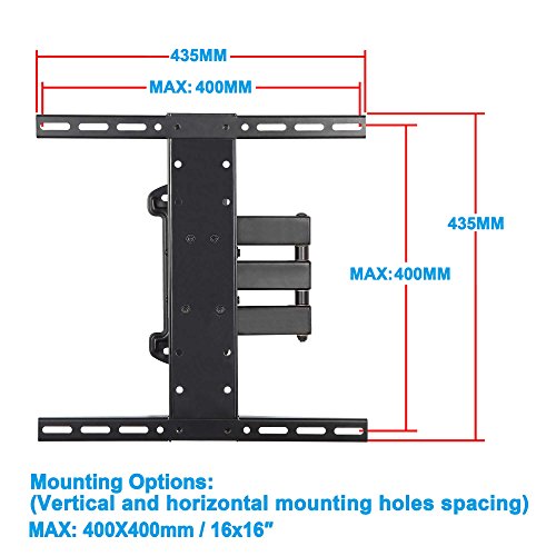 -. Feature : Fits for most of 26-55" TVs sold today. It fits TVs with mounting holes as close as 8"X 8" or as wide as 16"x16" (in TV terms - VESA 200X200mm to 400X400mm). Specifically, it fits VESA 200X200mm, 300X200mm, 300X300mm, 400X200mm, 400X300mm, 400X400mm. / "工" shape bracket frame design provides flexible and sufficient room for cable pling in, prevents potential problem of power/cables input being blocked by the mounting brackets (Specially this mount is perfect to mount some LG TV models which have certain patterns of VESA hole and power/cable input, please check this first P.R.Ior to making purchase decision) . / +5°/-15° Tilt, +/-90°Swivel and +/-4°rotate for maximum viewing flexibility, Post-installation level adjustment allows the TV to perfectly level. Articulating arm retracts 3"(to wall) to save space, and extends up to 14" from the wall. / All hardware, 6' HDMI cable, bubble level included. Cable management on arm with Velcro cable ties. Anchor included is ONLY for concrete wall installation NOT for dry wall installation! / Automatic robot welding technology makes whole unit sturdy, ensures mounted TV stable and secure. Smooth welding joint makes whole unit with good appearance.