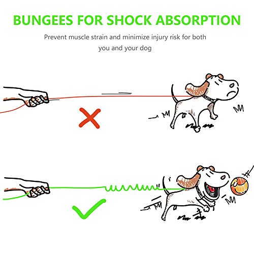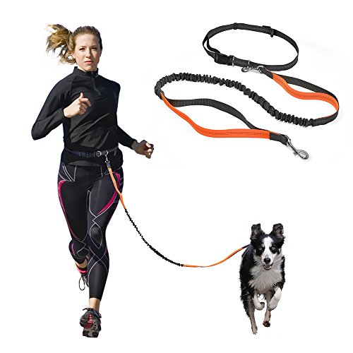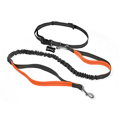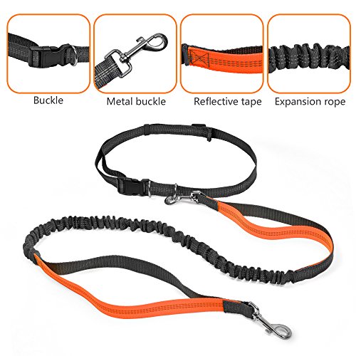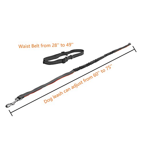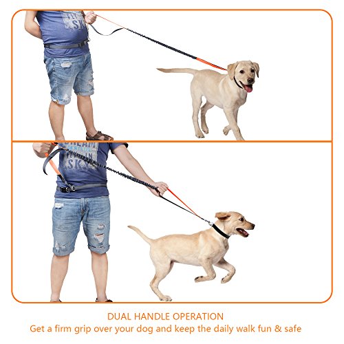 Hands Free Design: With waist band, enjoy your running without feeling restrained by your dog Double Handles: Giving more freedom for your dogs when using the waist handle, giving more control when using the collar handle Strong Bungee Band: Reduce back strain and the risk of getting hurt Night Reflective Band: Providing more safety desgin for you and your dog at night Fit for All Size Dogs: Fit for up to 150 lb dogs with no worry
