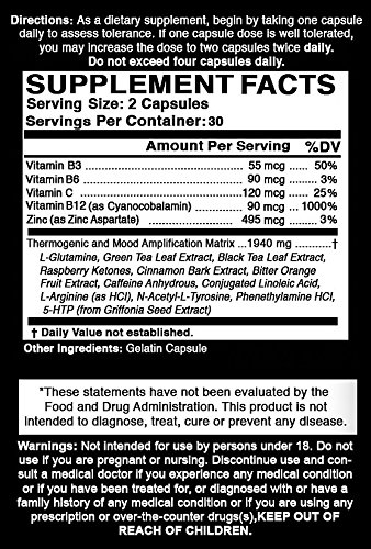 -. Feature : Supercharges the metabolism for superior thermogenic activity, fat burning potential, increased waist slimming, and produces a better response to weight loss exercises. * / Clinically proven, all-natural mood enhancers bring your mind into a focused, serene, uplifted state.* / Fortified with B Vitamins, cognitive supporting amino acids, along with the most powerful antioxidants on the market!* / Includes a dynamic "Tri-Phase" blend of clinically proven cognitive and energy enhancers for a ly energized and focused state.* / One of the only fat burners Manufactured in a Fortune 500 laboratory that holds every major certification from GMP, NSF and TGA while also being a distinguished member of the Natural Products Association®.