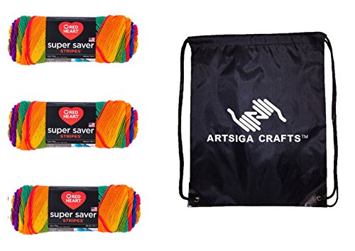 Red Heart Super Saver Stripe Yarn (3-Pack) Favorite Stirpe E300-4965 with 1 Artsiga Crafts Project Bag