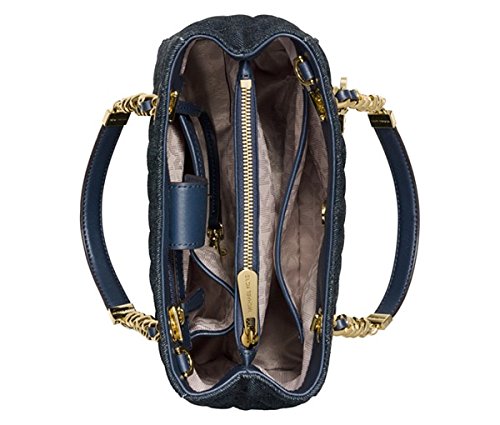 100% authentic 6-1/2"L double handles; 18"-21"L adjustable long strap Magnetic snap closure Exterior features gold-tone hardware, chain-link detail and hanging logo medallion Interior features center zip compartment, 1 zip pocket, 2 open pockets, 1 cellphone pocket and key chain 11" W x 8-1/2" H x 4-1/2" DFeature