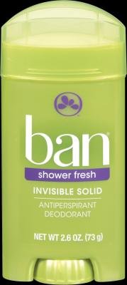 -. Binding : Health and Beauty -. Brand : Ban -. EAN : 0019045010288 -. Feature : 24 hr odor & wetness protection -. Label : KAO USA INC. -. Manufacturer : KAO USA INC. -. MPN : CTX -. PackageQuantity : 6 -. PartNumber : CTX -. ProductGroup : Beauty -. ProductTypeName : HEALTH_PERSONAL_CARE -. Publisher : KAO USA INC. -. Studio : KAO USA INC. -. Title : Ban Shower Fresh Invisible Solid Antiperspirant Deodorant 2.6 oz (Pack of 6) -. UPC : 019045010288