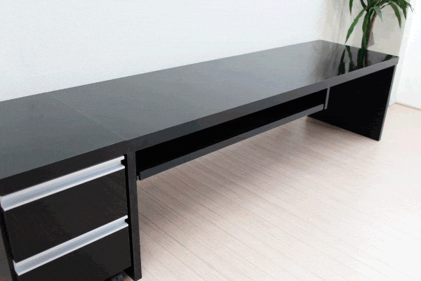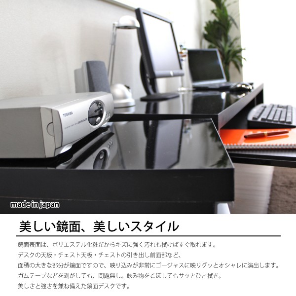 ■デスク・キャビネットの天板・キャビネットの引き出し前面が鏡面仕上げ。(デスクの天板は、35mmの厚)