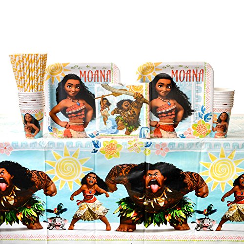 -. Title : Moana Party Supplies Pack for 16 Guests - Straws, Dinner Plates, Lunch Napkins, Cups, and Table Cover