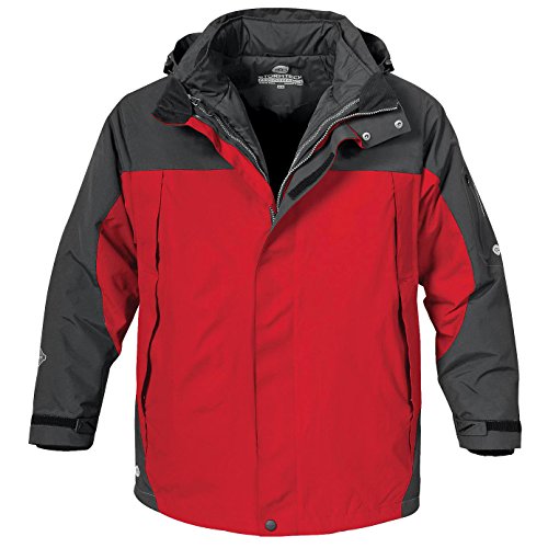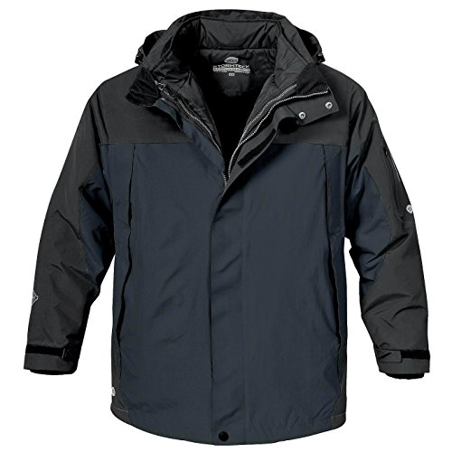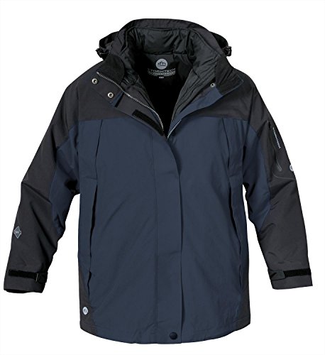 Binding : Apparel Product Description Waterproof Breathable 5 in one 1 Parka by Stormtech . Mid-length, waterproof/breathable and fully seam-sealed. Centre front placket with elastic gusset and snaps. Chest and upper sleeve yokes. Front welted panels with zippered pockets. Underarm zippered vents. Inside zippered pocket. Adjustable drawcord and Velcro cuff tabs. Zippered welded bicep pocket. Detachable, adjustable hood. Interchangeable zip-out thermal liner with zip-off sleeves. Size Chest (to fit) S - 35/38" M - 39/42" L - 43/46" XL - 47/50" 2XL - 50/53" 0