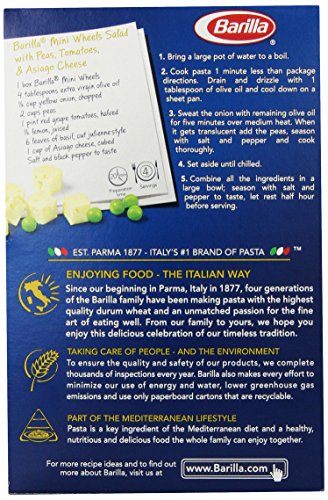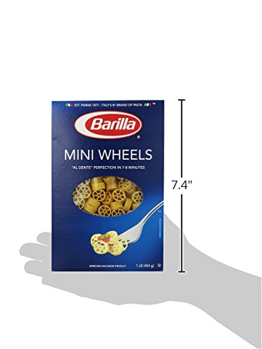 -. Binding : Grocery -. Brand : Barilla -. EAN : 0076808535594 -. Feature : Classic pasta shape that originated in Italy in the 1950s, inspired by modern industry / Creates a fun and flavorful eating experience for kids and grown-ups alike / Best when paired with olive oil or any smooth tomato or dairy-based sauce / Great shape for pasta salads / Kosher certified -. Label : Barilla Pasta -. Manufacturer : Barilla Pasta -. Model : 1000010553 -. NumberOfItems : 1 -. PackageQuantity : 1 -. ProductGroup : Pantry -. ProductTypeName : GROCERY -. Publisher : Barilla Pasta -. ReleaseDate : 2016-06-15 -. Size : 16 Ounce -. Studio : Barilla Pasta -. Title : Barilla Pasta, Mini Wheels, 16 Ounce -. UPC : 076808535594