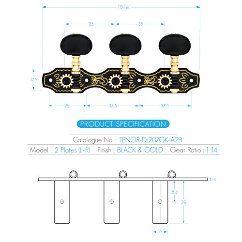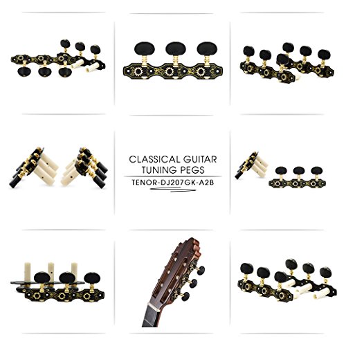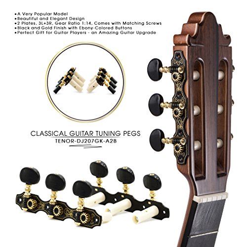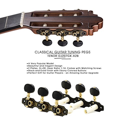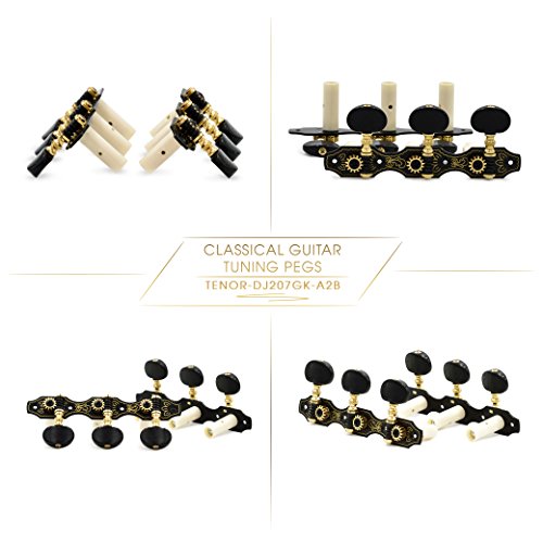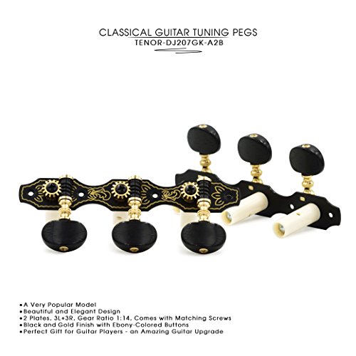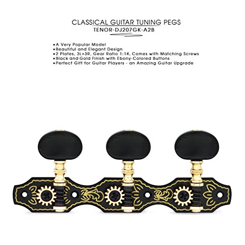 DJ207GK-A2B TENOR Classical Guitar Tuners, Tuning Key Pegs/Machine Heads for Classical or Flamenco Guitar in Black and Gold with Ebony Colored Buttons.