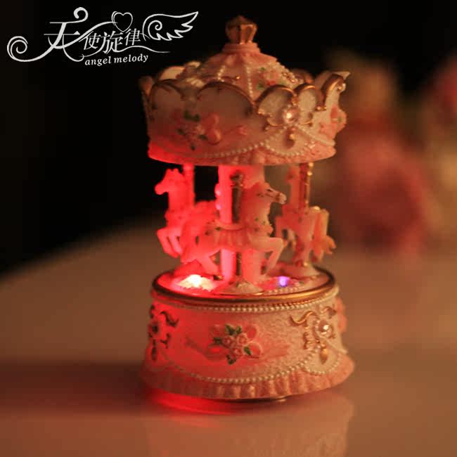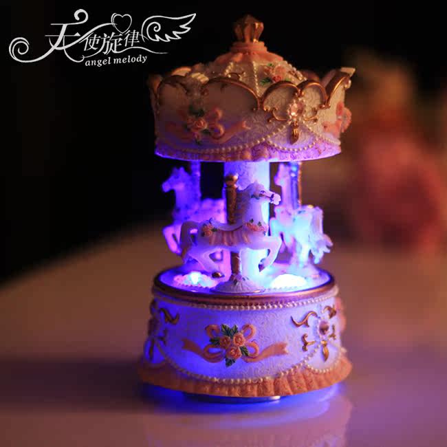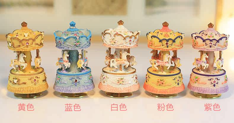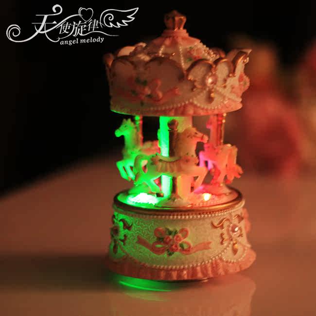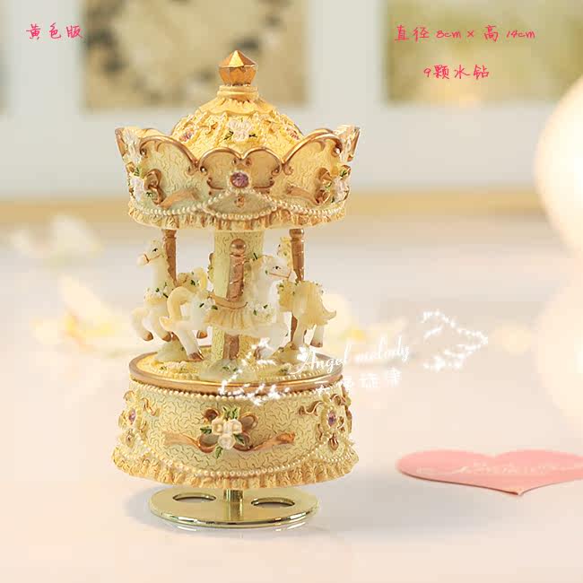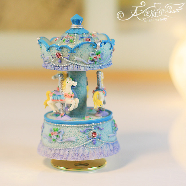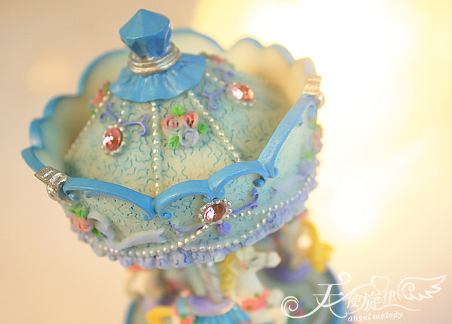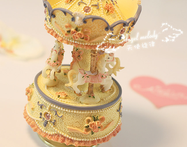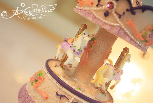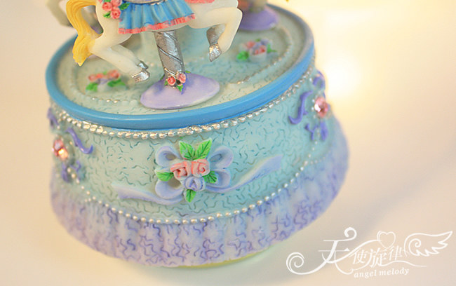 底座下面有一个金属转盘,旋转上发条,放在桌上木马会跟随音乐缓缓转动。